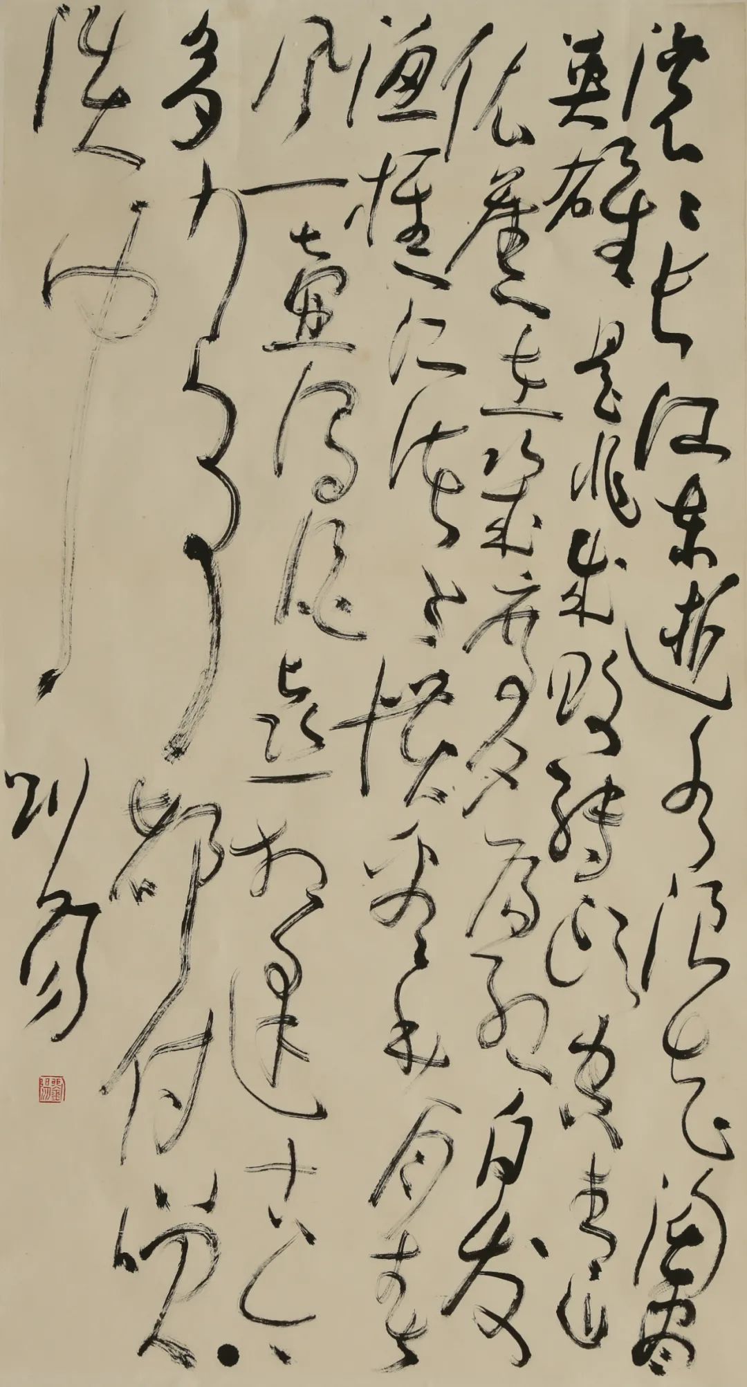 “除了工作和生活,我最需要的是飛翔。精神飛翔起來,心飛翔起來,我就飛翔起來。要飛翔談何易,要輕,再輕再輕,極輕極輕;要空,再空再空,極空極空。把物質(zhì)置于地上,精神放飛天空。物質(zhì)低了,精神才可能試飛,精神才能夠高飛。好在書法可以假我翅膀。揮筆乾坤在胸,心追手摩快意遨游,已而徐徐停頓,這是我作草的基本節(jié)律。我迷戀精神的風(fēng)馳電掣和徐徐停息中的內(nèi)心顧盼,因此而生多姿多彩賦予同一法則草創(chuàng)的作品百般儀態(tài)千般景象萬般風(fēng)光。殊不覺這精神的飛馳內(nèi)心的顧盼就是情懷,千古深情,萬象懷抱。草,絕對是一種境界。這樣一種境界。