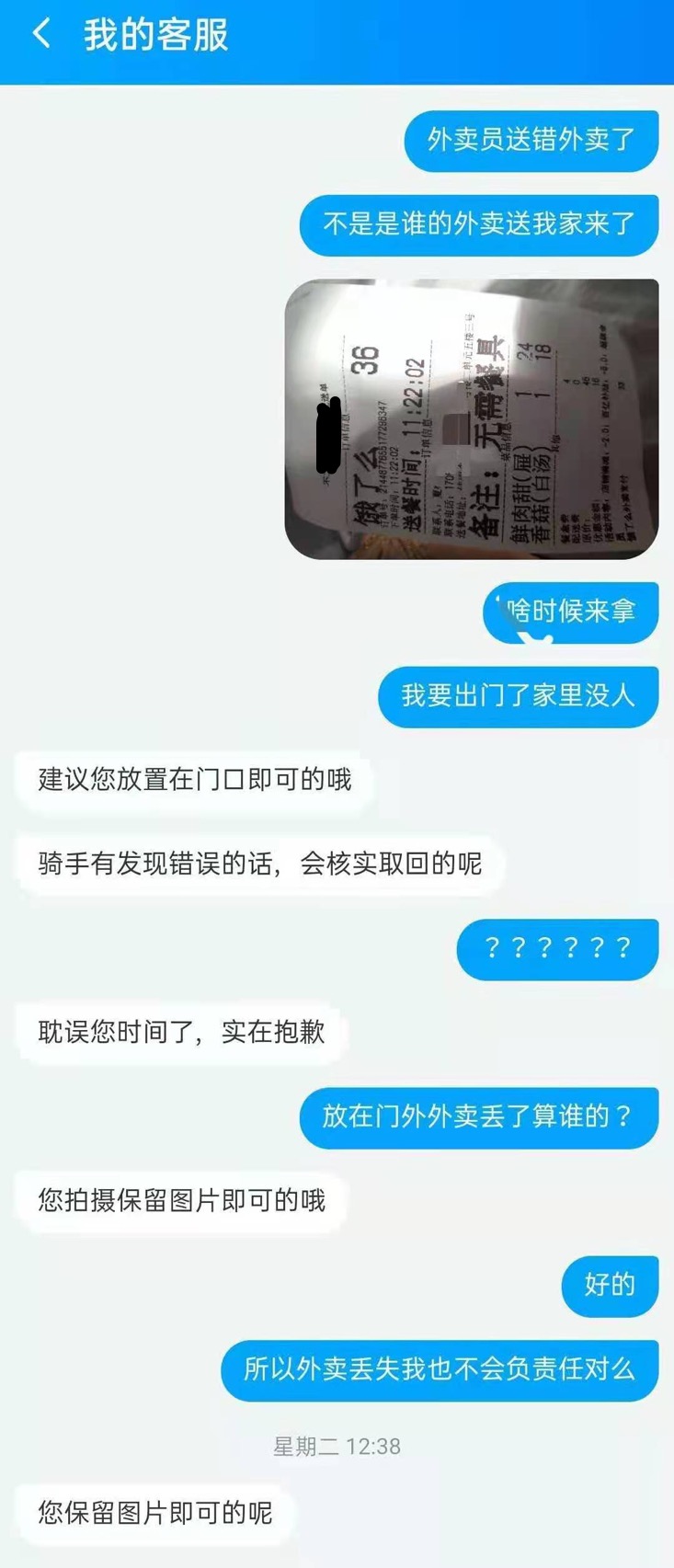 2月28日,張女士告訴澎湃新聞,她在發(fā)現(xiàn)外賣(mài)送錯(cuò)之后,立刻按照外賣(mài)小票上餓了么平臺(tái)提供的轉(zhuǎn)接號(hào)碼聯(lián)系了訂單主人夏女士,告知夏女士外賣(mài)送錯(cuò)的事,并詢問(wèn)夏女士是自己來(lái)取外賣(mài)還是騎手來(lái)拿。此外,張女士表示,在發(fā)現(xiàn)這是一份送錯(cuò)的外賣(mài)后,她也通過(guò)餓了么APP找到了人工客服,和人工客服說(shuō)明了此事。據(jù)張女士所言,客服給予她的解決方案是把外賣(mài)放在門(mén)口,可以拍攝照片存證,但客服并未回答外賣(mài)放門(mén)外丟了誰(shuí)負(fù)責(zé)的問(wèn)題。