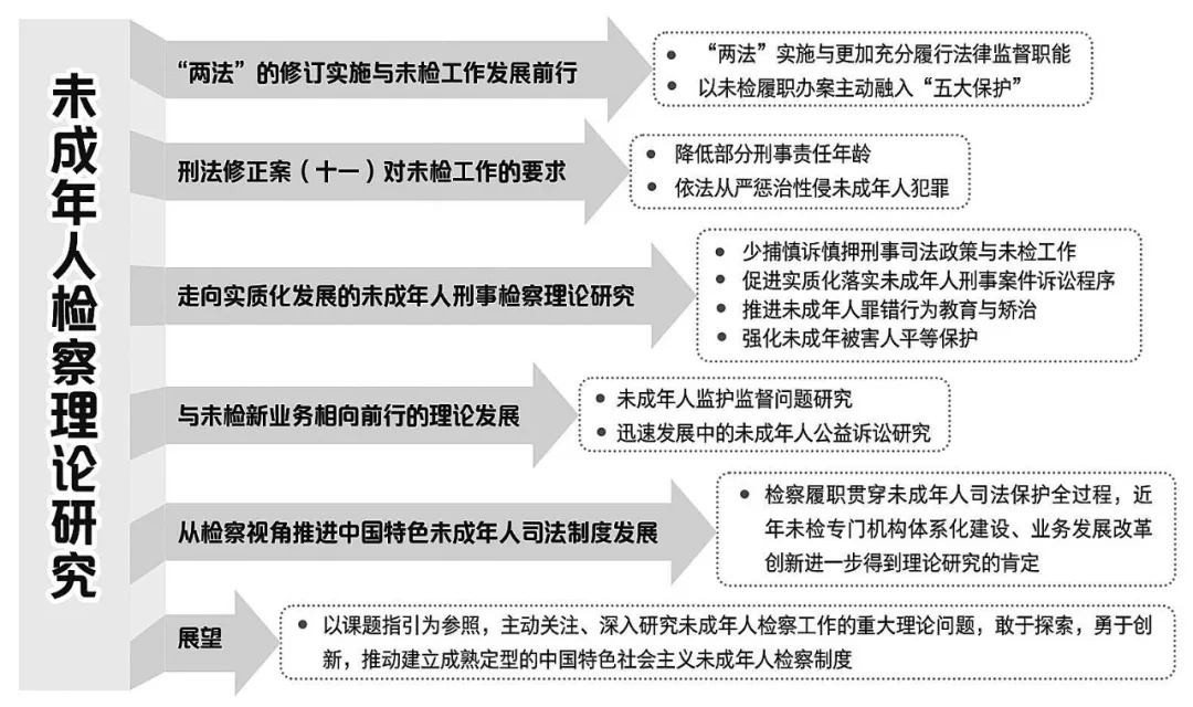 ■ 未檢理論研究以習近平法治思想為指導,圍繞更加充分履行法律監(jiān)督職能、主動融入“五大保護”,關注未成年人檢察工作高質(zhì)量發(fā)展,積極推進檢察機關支持起訴、督促監(jiān)護、未成年人公益訴訟檢察等新興業(yè)務發(fā)展,呈現(xiàn)出一種持續(xù)深化與繁榮發(fā)展的態(tài)勢。
