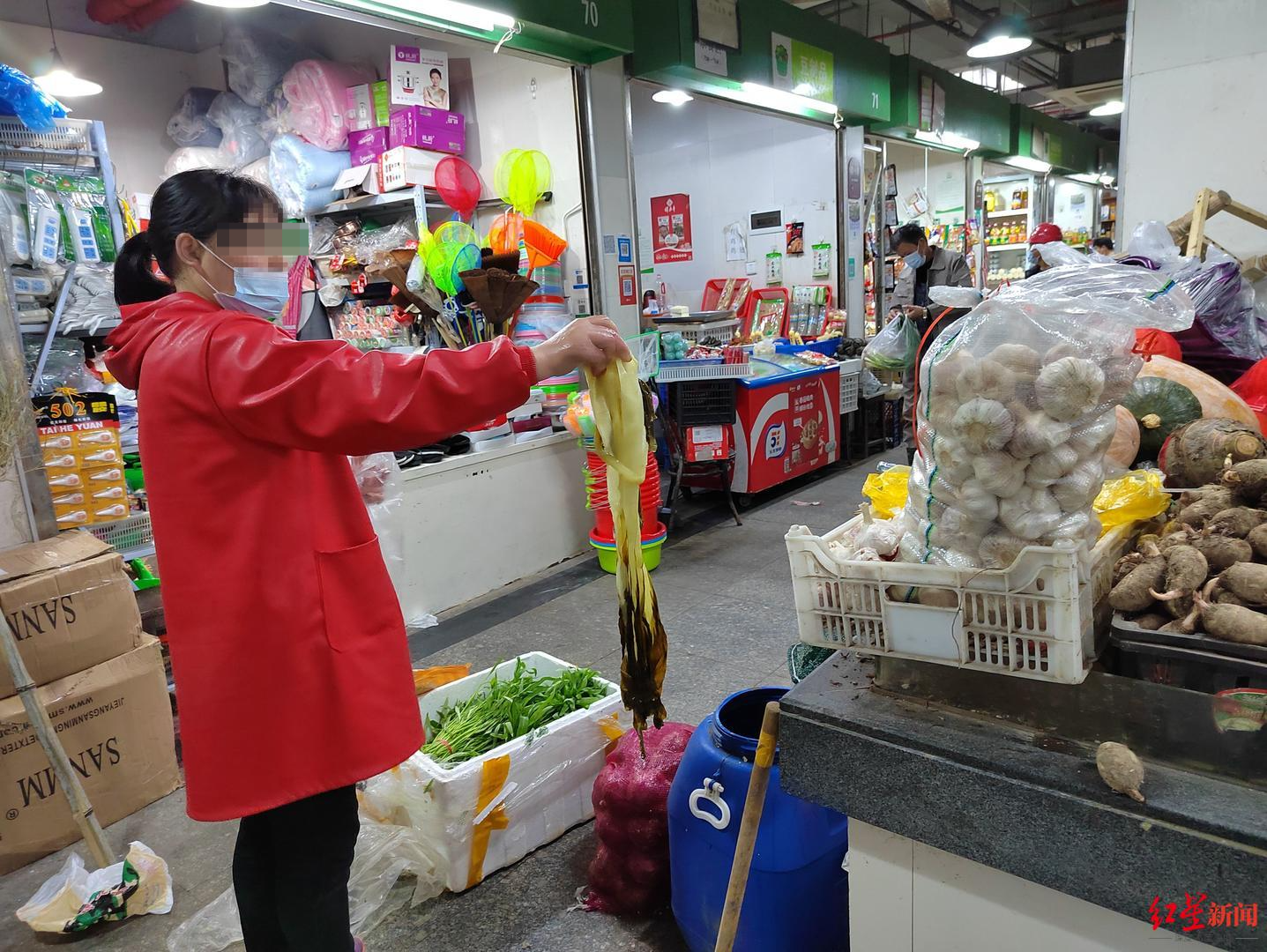 在陳先生家附近的一個(gè)農(nóng)貿(mào)市場(chǎng),紅星新聞?dòng)浾咦⒁獾接幸患疑虘粼阡N售冬腌菜。這位商戶稱,售賣的冬腌菜不是自己做的,是從村民那里購買的。