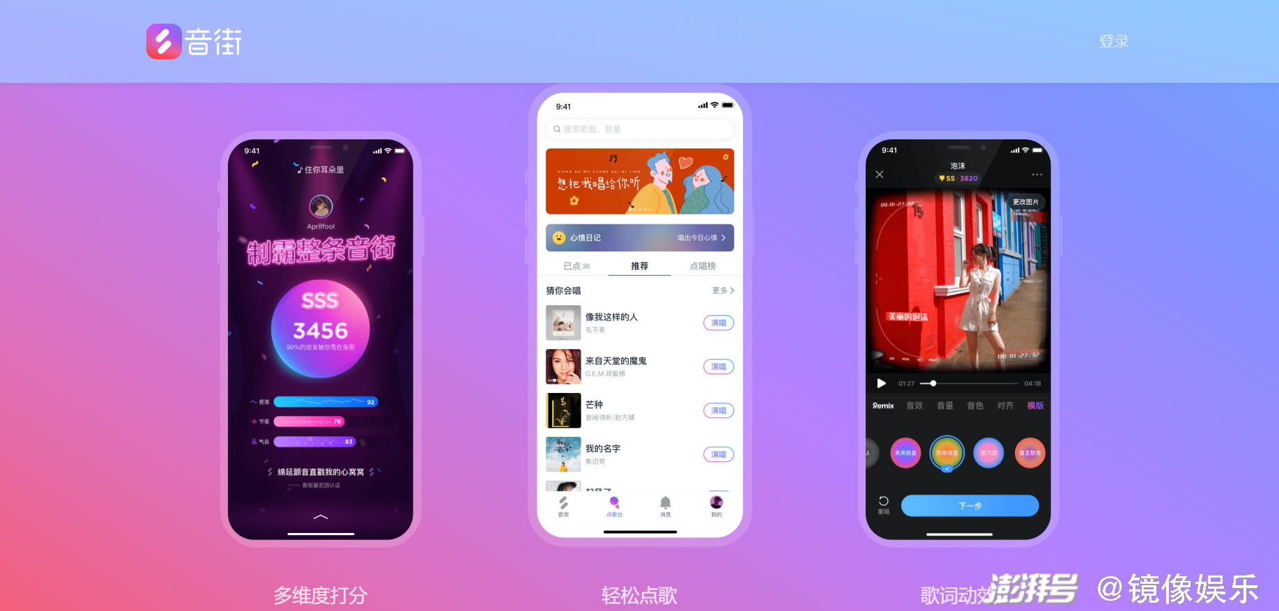 2020年6月16日,網(wǎng)易云發(fā)布了專為年輕人打造的獨(dú)立K歌APP音街。這一特點(diǎn)也在產(chǎn)品設(shè)計(jì)上得以體現(xiàn):音街主打輕松點(diǎn)唱、優(yōu)質(zhì)推薦、歌詞動(dòng)效、多維度打分、片段短唱等。和其他K歌APP不同的是,音街打開后的默認(rèn)界面并非點(diǎn)唱,而是推薦其他用戶的演唱歌曲,致力于結(jié)識(shí)音樂好友,在某種意義上它更強(qiáng)調(diào)內(nèi)容和社區(qū),而非K歌的工具屬性。