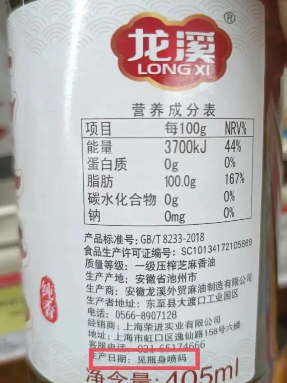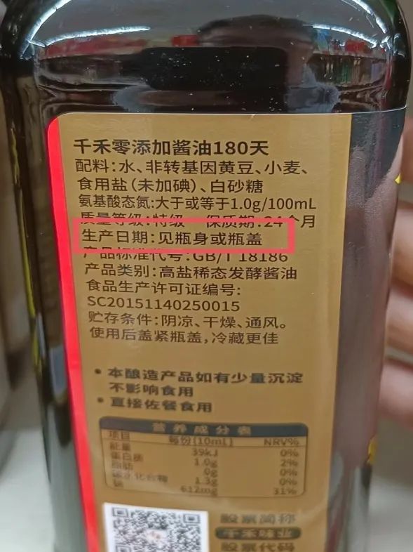 但大多數(shù)企業(yè)給消費者關(guān)于生產(chǎn)日期標識位置的提示較為模糊,如“見瓶身”“見瓶身或瓶蓋”等,也有企業(yè)相對精確些,如“見瓶頸”“見瓶口”,比如“龍溪一級壓榨芝麻香油”、“千禾零添加醬油180天”等。
