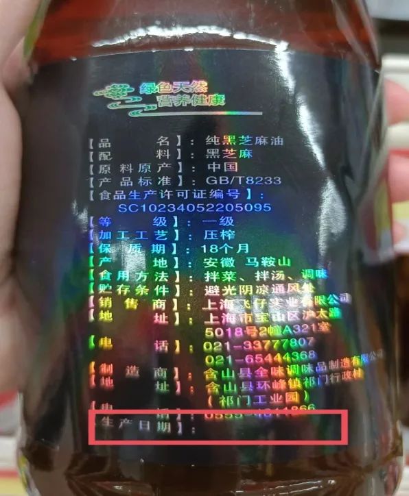我們也發(fā)現(xiàn)個別企業(yè)對生產(chǎn)日期印刻的具體位置沒有任何提示和說明,比如“君旗純黑芝麻香油”。其次,瓶裝的廚房調(diào)料大多是深色液體,瓶蓋也以深色為主。而大多數(shù)企業(yè)是將生產(chǎn)日期信息刻印在瓶身上的,在深色背景下,淺淺的、近乎透明的生產(chǎn)日期信息真的很不清晰,我們找起來都覺得很費眼,別說上了年紀的老年消費者了。比如“三添芝麻油”、“三添辣椒油”等。