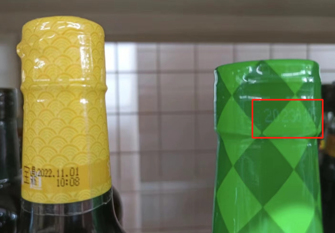 此外,我們還發(fā)現(xiàn),有些企業(yè)雖然將生產(chǎn)日期打印在包裝紙或瓶口熱縮膜上,要么印跡模糊,要么使用了和底色相似的顏色,辨識度極低。比如下圖左邊為“寶鼎天魚上海辣醬油風(fēng)味調(diào)味汁”,在黃色熱塑膜上印刻了黑色的生產(chǎn)日期,對比度較強。而右邊為“鼎鼎鮮135頭道醬油”,在綠白色熱塑膜上使用近乎透明的淺白色印跡,對比度很低,可真是太為難消費者了!