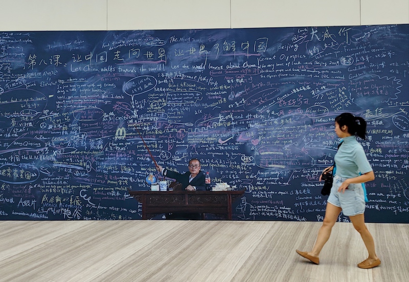 《跟我學(xué)》拍攝于 2003 年,當(dāng)時(shí)王慶松在北京電影制片廠搭了一個(gè)長(zhǎng) 8 米、高 4 米的黑板,上面寫了很多中英文的詞匯和句子,有些是明顯的錯(cuò)誤。藝術(shù)家本人坐在畫面正中,用教棒指著黑板。“學(xué)習(xí)英語(yǔ)令我壓力很大,正是這種壓力給了我觸動(dòng),拍了《跟我學(xué)》?!蓖鯌c松坦言,為《跟我學(xué)》黑板上的文字,他準(zhǔn)備了五年。