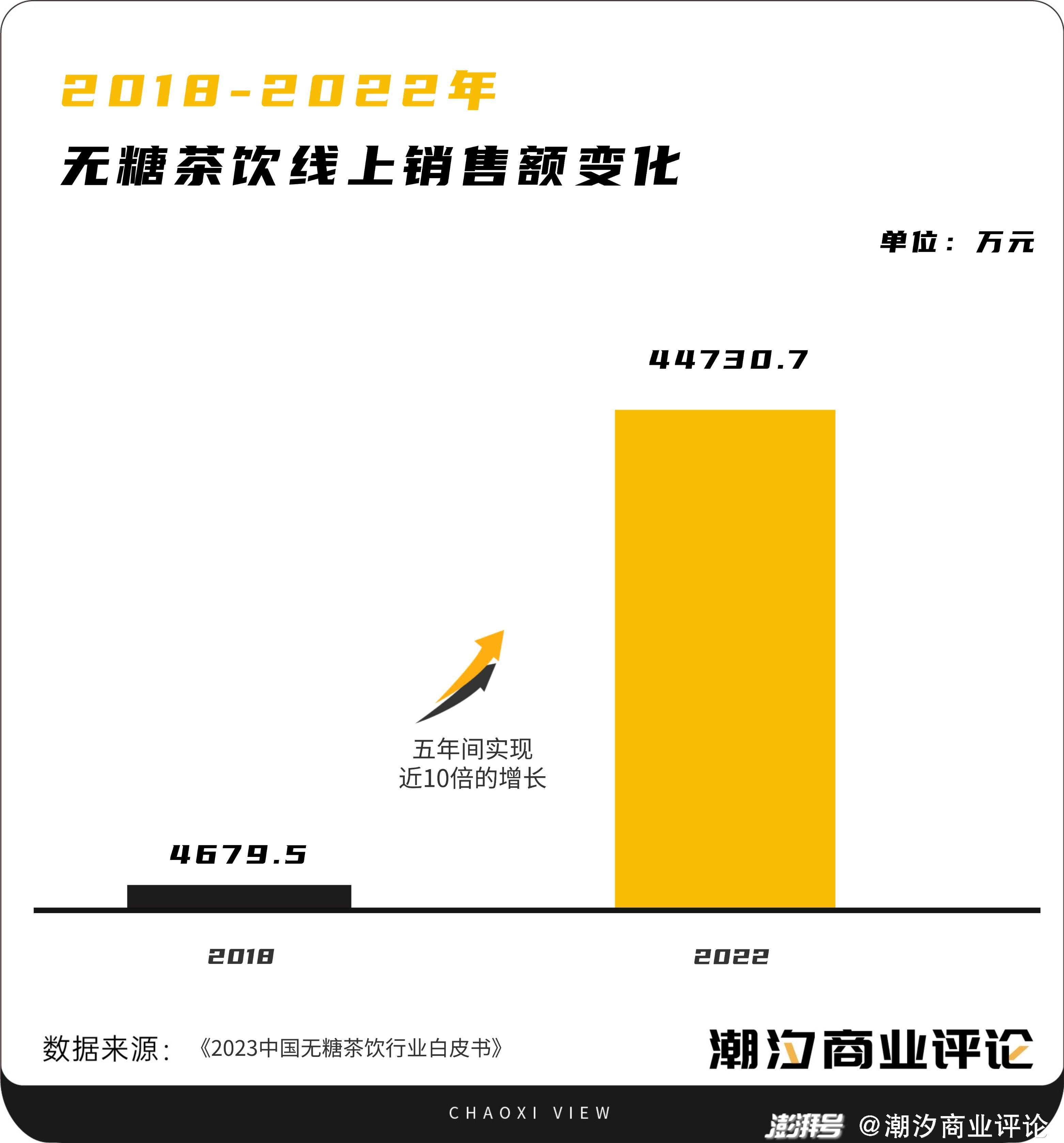 據(jù)億歐智庫(kù)發(fā)布的《2023中國(guó)無(wú)糖茶飲行業(yè)白皮書(shū)》,通過(guò)分析天貓?zhí)詫毱脚_(tái)近五年的無(wú)糖茶飲料銷(xiāo)售額發(fā)現(xiàn),無(wú)糖茶飲在線上的銷(xiāo)售額從2018年的4679.5萬(wàn)元,到2022年達(dá)到44730.7萬(wàn)元,五年間實(shí)現(xiàn)了近10倍的增長(zhǎng)。