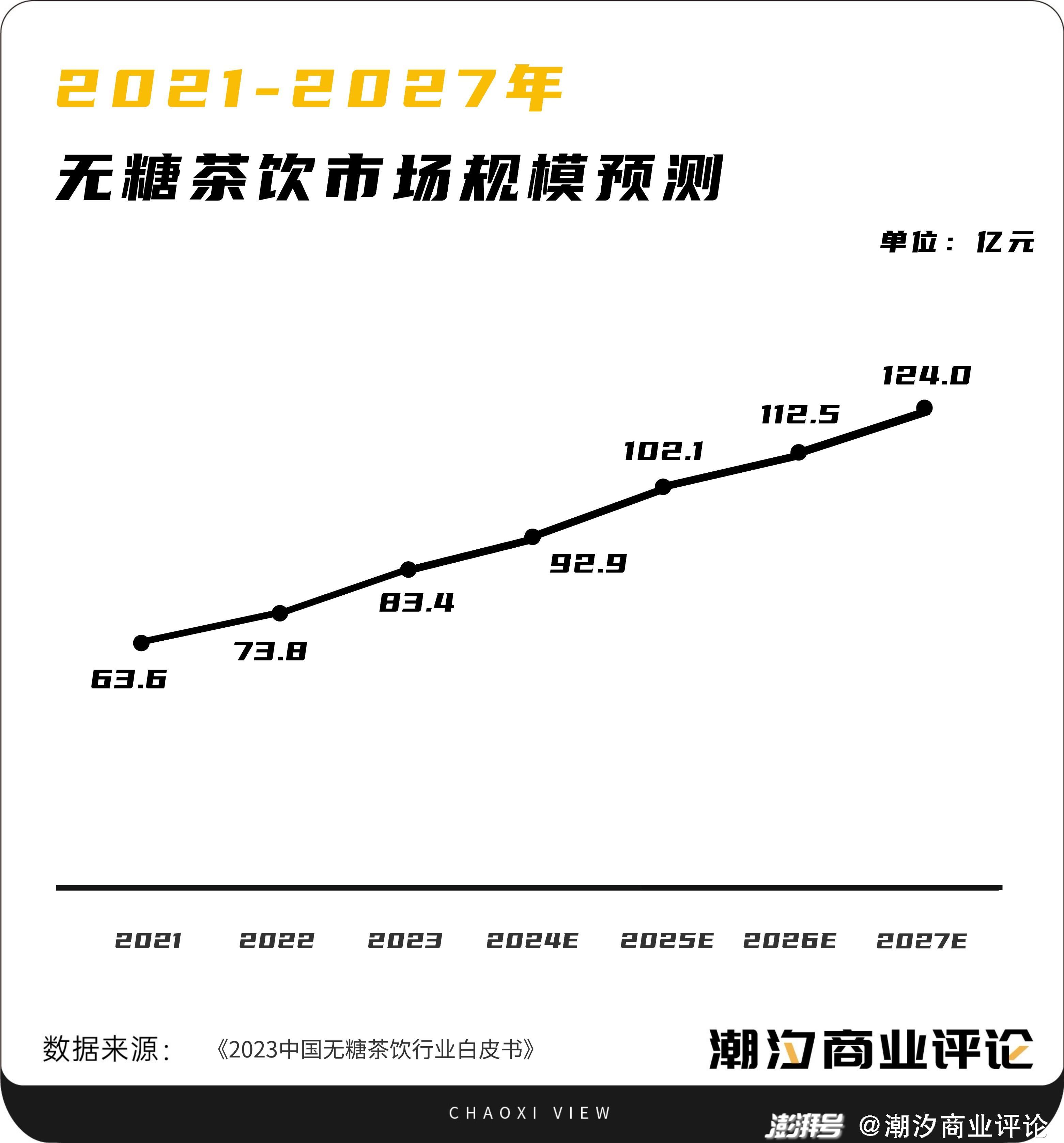 Euromonitor數(shù)據(jù)顯示,預(yù)計(jì)到2027年,中國(guó)無(wú)糖茶飲市場(chǎng)規(guī)模將達(dá)到124億元,未來(lái)五年,中國(guó)茶飲市場(chǎng)將進(jìn)入無(wú)糖茶飲高速增長(zhǎng)期。