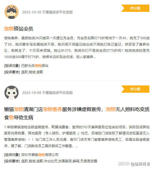 黑貓投訴平臺(tái)上,搜索“寵物寄養(yǎng)”能看到多條投訴。投訴原因包括價(jià)格不透明、虛假宣傳、店家未盡到責(zé)任、無證經(jīng)營(yíng)、不退押金等。社交平臺(tái)上,也有不少吐槽帖,貓?jiān)趯櫸锏昙酿B(yǎng)期間丟失、寵物寄養(yǎng)樂園跑路、虐待寵物等。