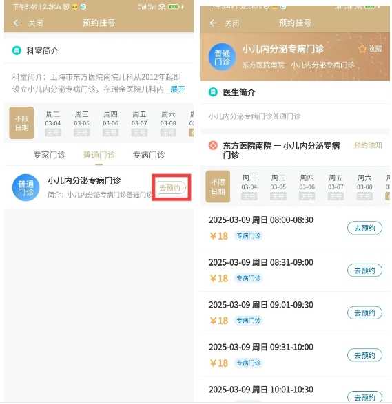 第三步:可選擇專家門診、普通門診、專病門診,這里我們以選擇普通門診為例,選擇合適的時間段點擊“預(yù)約”后,按照提示選擇證件預(yù)約或就診卡預(yù)約,填寫個人信息即可。
