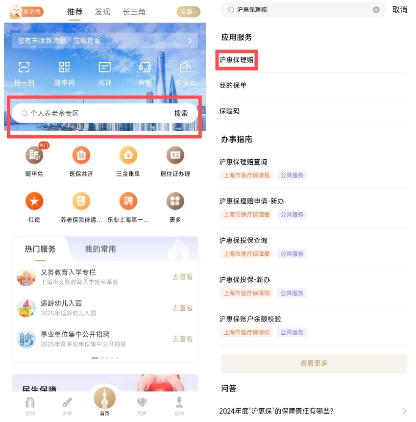 第一步:打開“隨申辦市民云”APP,搜索“滬惠保理賠”后點擊進入服務(wù)專區(qū)頁面。