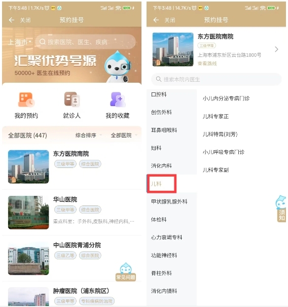 注意:兒科需要使用兒童身份證,大于16歲無法預(yù)約兒科。