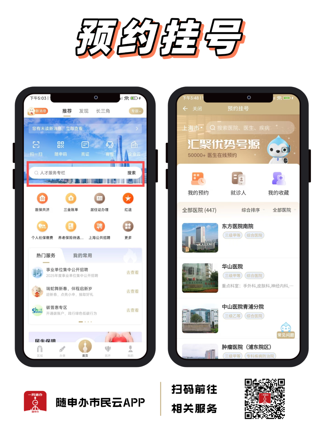 第一步:“隨申辦市民云”APP,搜索進入【預(yù)約掛號】服務(wù),或掃描下方二維碼