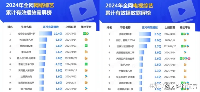 不僅如此,從云合的年度榜單上,也能看出芒果綜藝的另一重隱憂,那就是網(wǎng)絡(luò)聲量遠(yuǎn)大于收視表現(xiàn)——成為全民熱議話題的《歌手2024》播放量僅有2.5億,《再見愛人第四季》也僅有3.9億,遠(yuǎn)不及受眾常年穩(wěn)定的“跑男”“五哈”“王牌”,而這幾檔都是愛優(yōu)騰三臺聯(lián)播。這意味著芒果TV在話題營銷上面爐火純青,但是并未成功將大部分“吃瓜群眾”轉(zhuǎn)化為平臺用戶。廣告業(yè)務(wù)營收的連年下滑,也從另一個側(cè)面印證了上述現(xiàn)象。