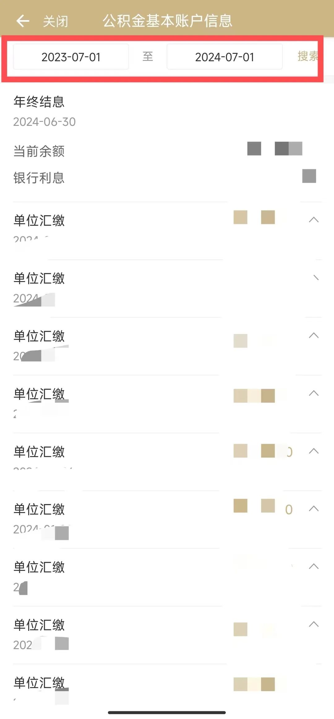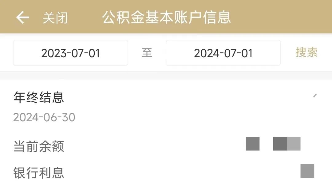 第四步:將查詢時(shí)間段設(shè)置為“2024-07-01”至“2025-06-30”,點(diǎn)擊查詢,即可查看本年度公積金結(jié)息具體金額與繳納明細(xì)。