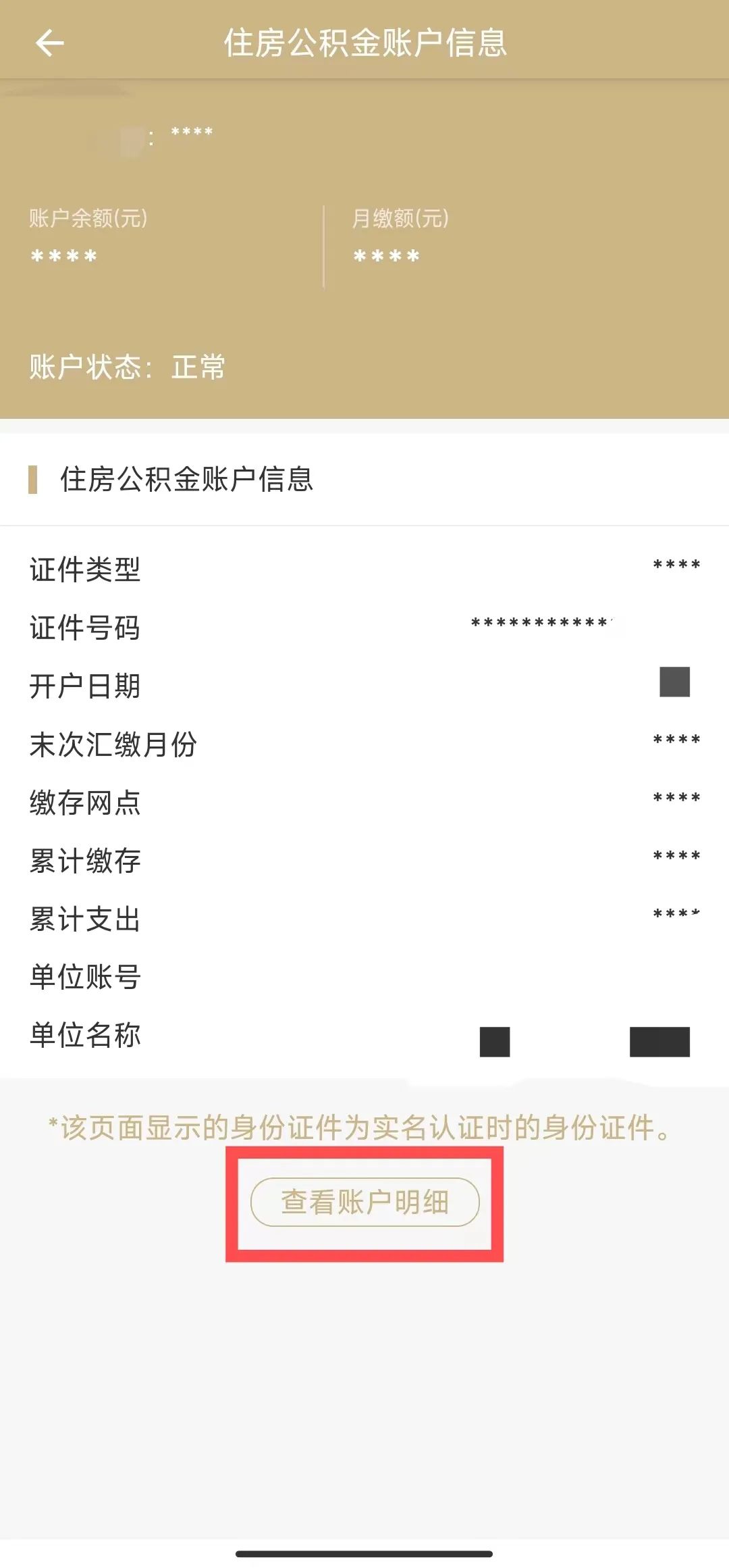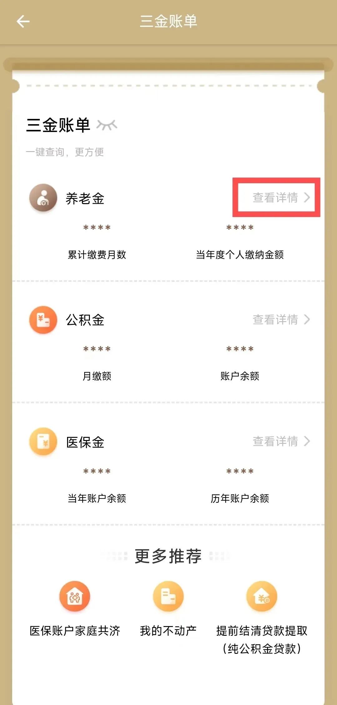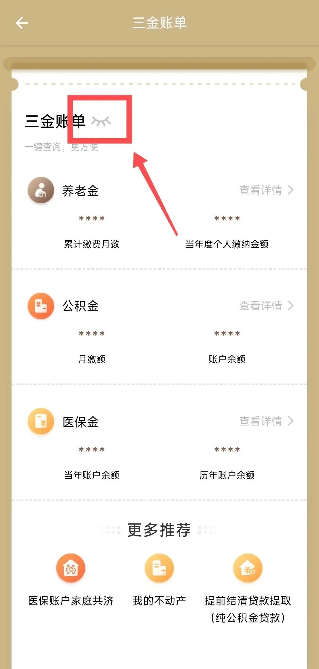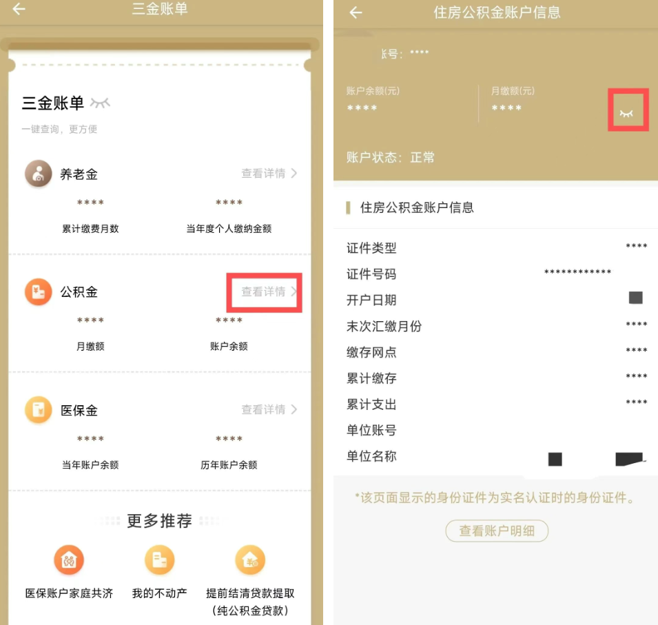 第二步:點(diǎn)擊“查看詳情”進(jìn)入“公積金”頁(yè)面,點(diǎn)擊“眼睛”按鈕,即可一鍵查看公積金賬戶信息、明細(xì)及補(bǔ)充公積金賬戶明細(xì)等。