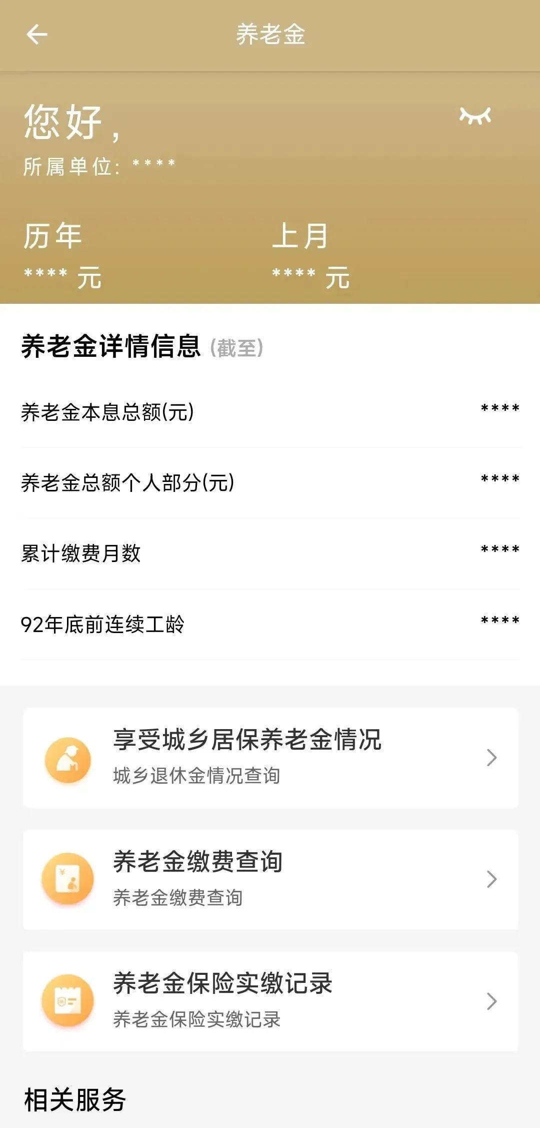 養(yǎng)老金詳情:點(diǎn)擊查看詳情后,可查看養(yǎng)老金歷年、上月、本息總額、累計(jì)繳費(fèi)月數(shù)等詳細(xì)信息。