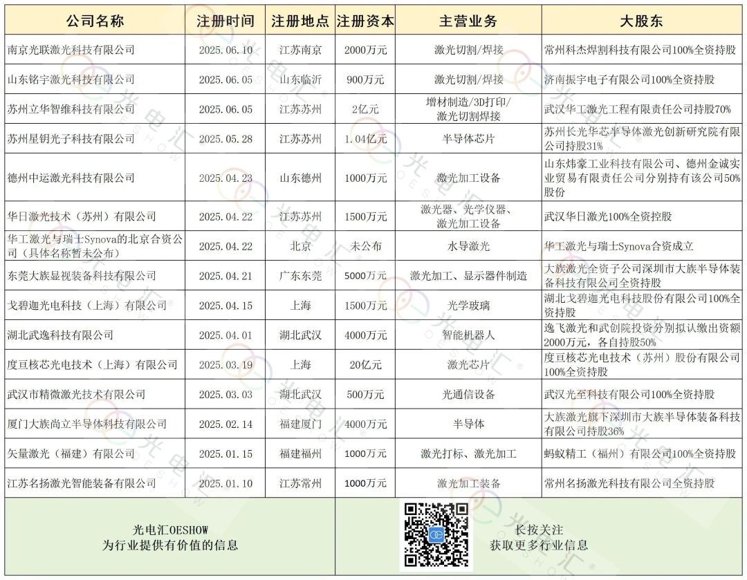 2025年上半年公開報道的國內新成立的激光公司匯總表