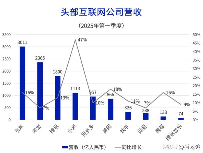 自營模式為主的京東仍然是營收之王,一個(gè)季度營收3011億元。超過千億的還有三家,分別是:阿里、騰訊、小米。