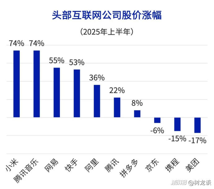 從2025年上半年的股價(jià)漲幅看:小米、騰訊音樂漲幅高達(dá)74%;網(wǎng)易、快手漲幅分別是55%、53%;阿里、騰訊漲幅跑贏恒生科技指數(shù)(19%);拼多多漲幅只有8%;美團(tuán)、攜程、京東分別下跌17%、15%和6%。