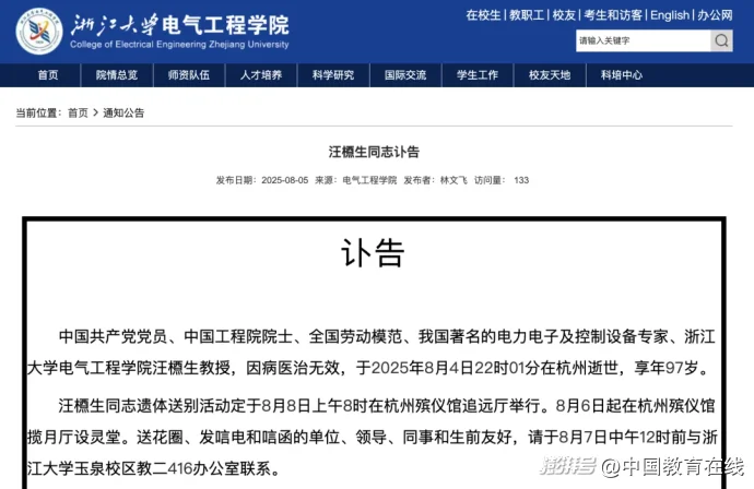 8月5日,浙江大學(xué)電氣工程學(xué)院發(fā)布訃告: