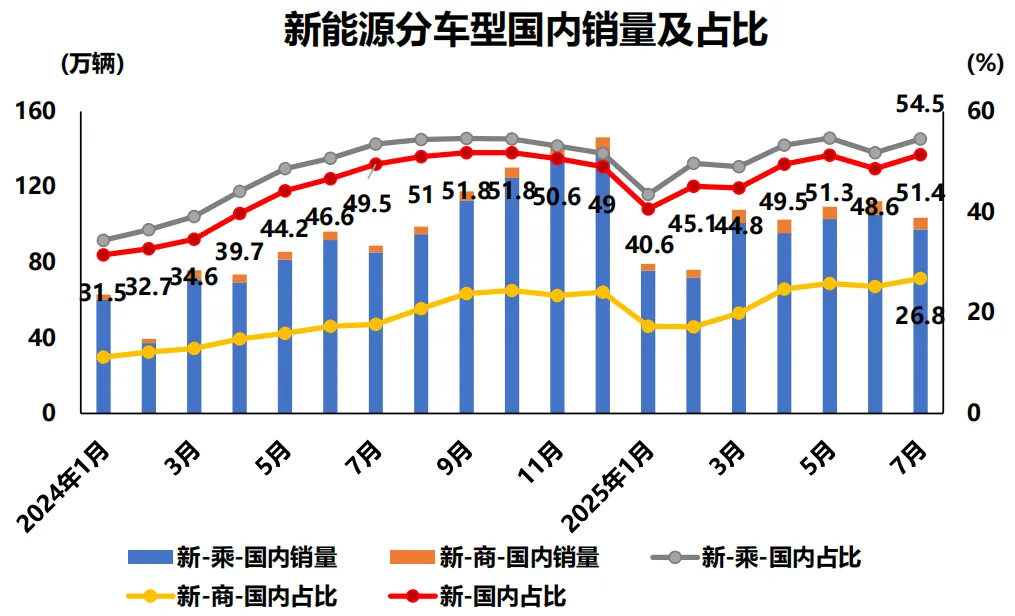 7月,新能源汽車新車銷量達(dá)到汽車新車總銷量的48.7%,其中新能源汽車國內(nèi)銷量占比達(dá)到51.4%。這是去年12月新能源汽車國內(nèi)銷量占比跌破50%以來,首次重回50%以上的高位。