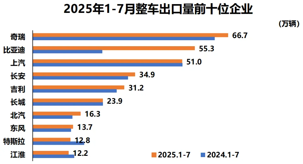 今年前7個月,整車出口前十企業(yè)中,奇瑞出口量達(dá)66.7萬輛,同比增長7.3%,占總出口量的18.1%。排名第二位的比亞迪今年出口增速最為顯著,出口達(dá)55.3萬輛,同比增長1.3倍。
