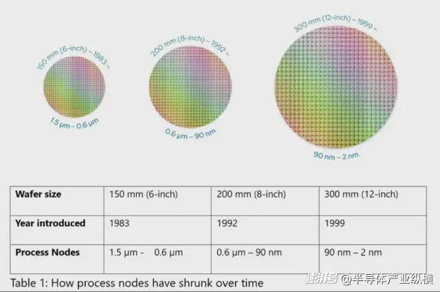 隨著工藝節(jié)點尺寸的不斷縮小,晶圓尺寸也從6英寸增大到8英寸,最終達到12英寸。除了摩爾定律之外,這種尺寸的增長對滿足日益增長的芯片需求并降低成本做出了決定性的貢獻。雖然12英寸晶圓已成為先進節(jié)點(<90 納米)的標準,但許多模擬和混合信號應用仍然停留在6英寸晶圓上,采用 0.6 微米等成熟節(jié)點(見表 1)。