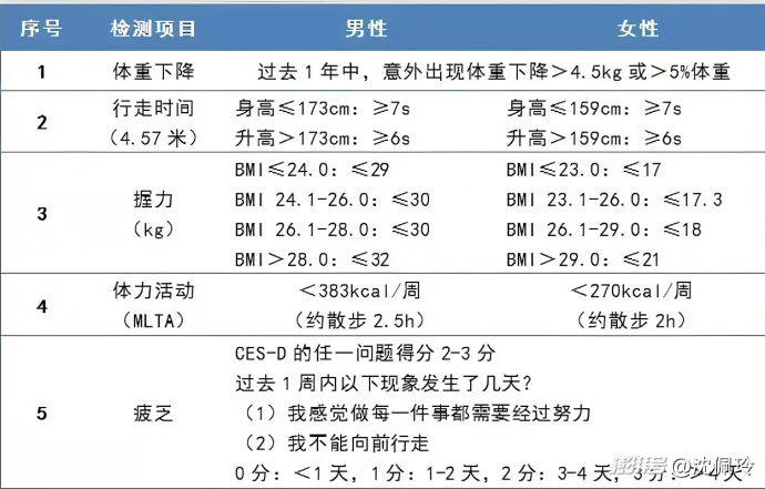 老年人的衰弱通常表現(xiàn)在五個(gè)方面: unintentional weight loss(非自愿體重減輕)、slowness(行走速度下降)、weakness(握力減弱)、low physical activity(體力活動(dòng)減少)和exhaustion(極度疲勞)。醫(yī)學(xué)上稱為“衰弱表型”,當(dāng)老人符合其中三項(xiàng),就可以被認(rèn)定為衰弱(詳見附圖)。
