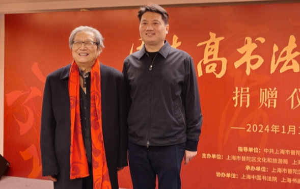 2024年1月,周志高(左)將珍藏的萬余冊書法典籍捐贈上海普陀區(qū)圖書館