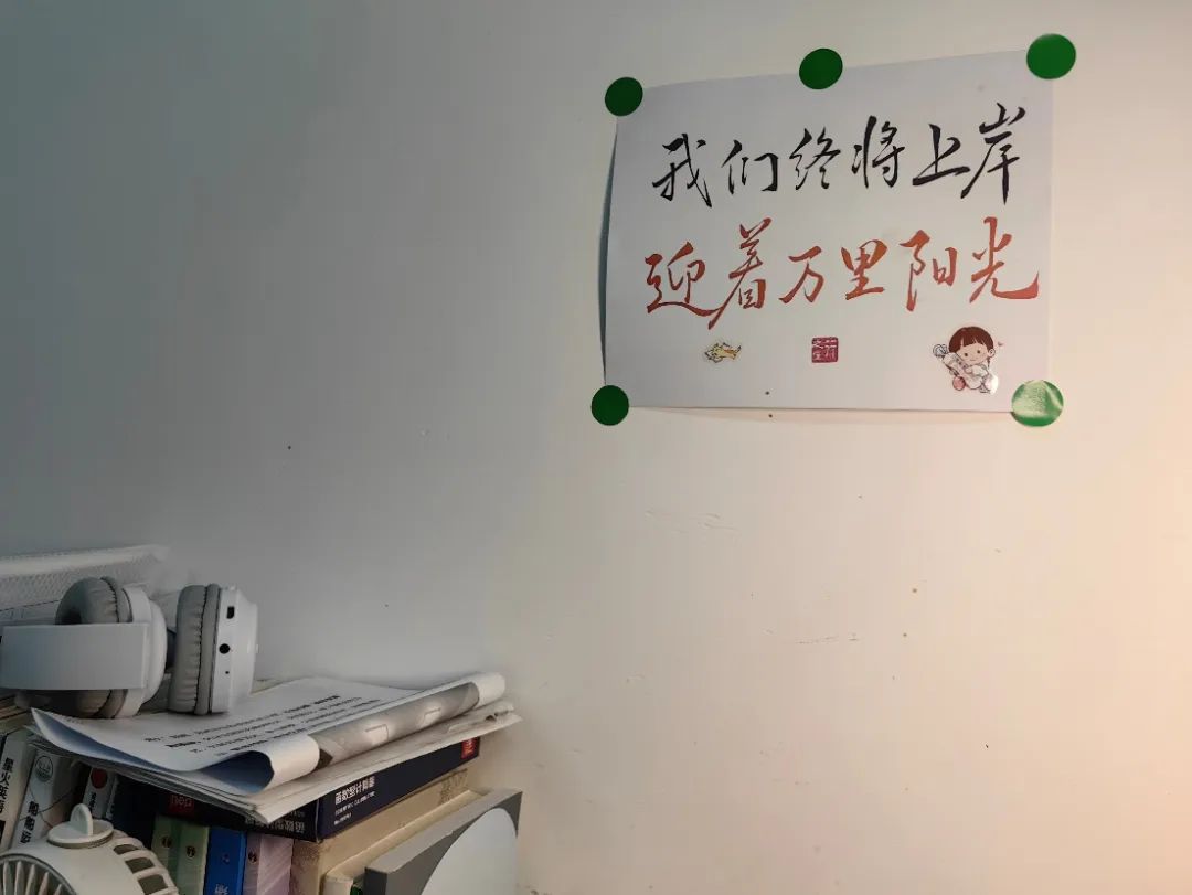 鄒貝貝貼在墻上的座右銘:“我們終將上岸 迎著萬里陽光”