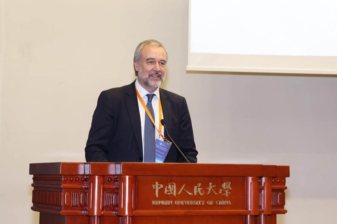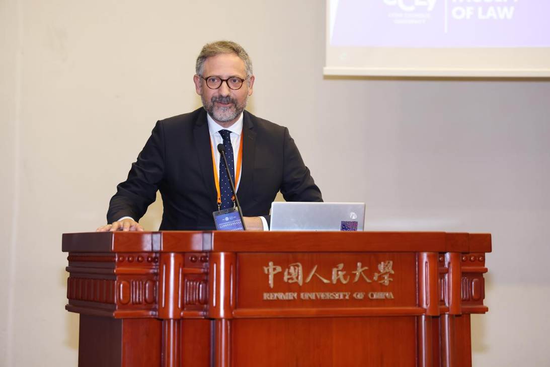 國(guó)際統(tǒng)一私法協(xié)會(huì)秘書長(zhǎng)Ignacio Tirado教授在致辭中闡述了法律與科技協(xié)同推動(dòng)可持續(xù)發(fā)展的重要性。他強(qiáng)調(diào),在數(shù)字時(shí)代帶來的全球機(jī)遇面前,各國(guó)亟需采取漸進(jìn)式立法與組織建設(shè)策略,重點(diǎn)關(guān)注流程重構(gòu)、可持續(xù)發(fā)展與技術(shù)應(yīng)用三大核心領(lǐng)域。Tirado教授分享了其團(tuán)隊(duì)正著力開發(fā)的電子債權(quán)平臺(tái)與供應(yīng)鏈金融工具等新一代數(shù)字化解決方案,指出這些創(chuàng)新工具致力于將傳統(tǒng)靜態(tài)業(yè)務(wù)模式轉(zhuǎn)變?yōu)閯?dòng)態(tài)、可交互的現(xiàn)代化實(shí)踐。在未來,這有望與各國(guó)政府建立靈活高效的合作機(jī)制,為跨境商事活動(dòng)提供堅(jiān)實(shí)的法律確定性保障。他呼吁,各國(guó)與國(guó)際組織應(yīng)把握技術(shù)機(jī)遇,不僅要發(fā)展先進(jìn)技術(shù)方案,更要構(gòu)建支撐全球數(shù)字經(jīng)濟(jì)可持續(xù)發(fā)展的法律框架。他表示,國(guó)際統(tǒng)一私法協(xié)會(huì)將繼續(xù)與中國(guó)人民大學(xué)法學(xué)院深化合作,推動(dòng)數(shù)字時(shí)代前沿法律問題的研究。