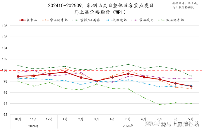 為了更好地分析乳制品類目整體價(jià)格持續(xù)變動(dòng)和走勢(shì),我們拉取了乳制品整體及其各重點(diǎn)類目,202410-202509的馬上贏價(jià)格指數(shù)WPI(詳細(xì)介紹參見(jiàn):新產(chǎn)品丨馬上贏價(jià)格指數(shù)(WPI)發(fā)布啦?。?。該指標(biāo)以100為基準(zhǔn)值,其數(shù)值上下波動(dòng)為類目的價(jià)格指數(shù)與去年同期價(jià)格指數(shù)的相對(duì)百分比,100表示與去年同月持平,高于100表示同比價(jià)格指數(shù)上升,低于100則表示同比價(jià)格下降。