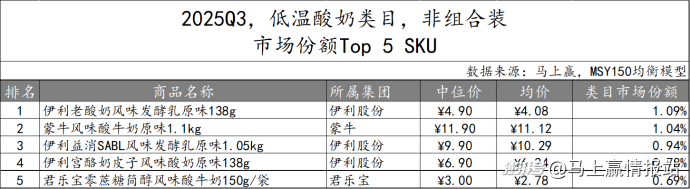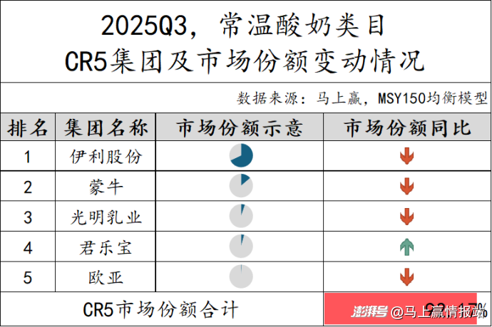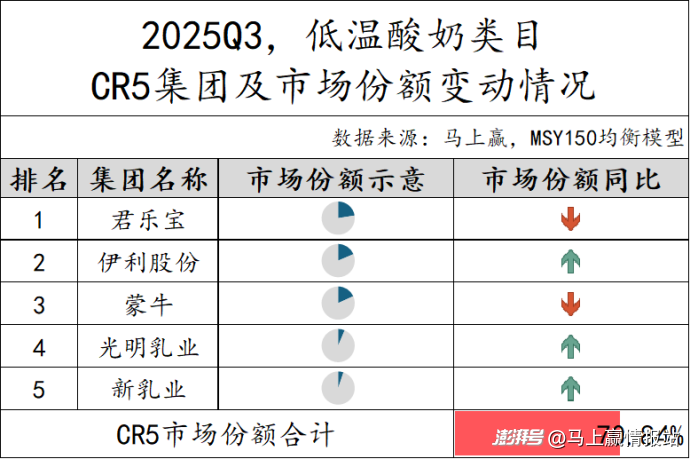 2025Q3,低溫酸奶CR5集團(tuán)由君樂(lè)寶、伊利股份、蒙牛、光明乳業(yè)和新乳業(yè)組成,市場(chǎng)份額合計(jì)為70.84%,集中度較高。從市場(chǎng)份額同比變動(dòng)來(lái)看,君樂(lè)寶、伊利股份與蒙牛占據(jù)前三的情況下,伊利股份同比增長(zhǎng),君樂(lè)寶、蒙牛同比下跌。另一個(gè)值得持續(xù)關(guān)注的點(diǎn)是,從市場(chǎng)份額示意上來(lái)看,君樂(lè)寶、伊利股份、蒙牛三個(gè)集團(tuán)在低溫酸奶中的市場(chǎng)份額已經(jīng)相當(dāng)接近,未來(lái)幾個(gè)季度可能在排名上產(chǎn)生變化。