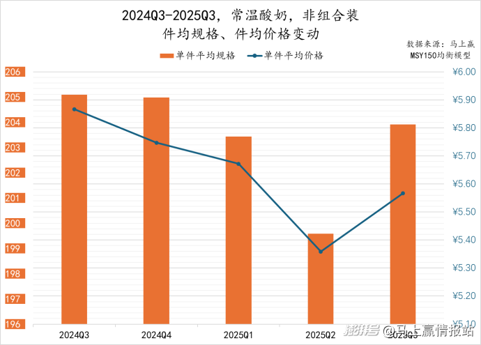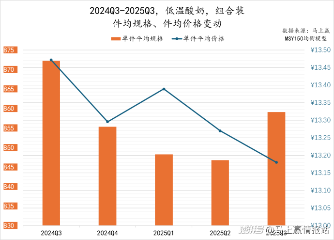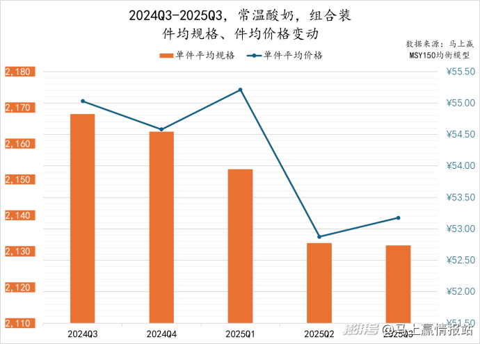 組合裝方面,常溫酸奶組合裝產(chǎn)品件均規(guī)格連續(xù)縮減,從2024Q3的2160ml逐季縮減至2025Q3的2130ml。件均價(jià)同樣波動(dòng)下降,除2025Q1或受節(jié)慶影響有所提升外,總體從2024Q3的55元跌至2025Q3的53元左右。