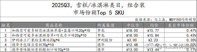 雪糕/冰淇淋組合裝產(chǎn)品TOP 5 SKU中,夢(mèng)龍“和路雪”系列產(chǎn)品占據(jù)前兩名,伊利股份“冰工廠”憑借小規(guī)格低價(jià)格位列第三。德華作為非頭部陣營(yíng)的集團(tuán)表現(xiàn)不俗, “德華手包綠豆雪糕” 和“原味酸奶雪糕”兩款產(chǎn)品以懷舊風(fēng)味的經(jīng)典造型和常規(guī)規(guī)格、多內(nèi)裝的策略,位列第四和第五,適配家庭囤貨和日常聚會(huì)分享等場(chǎng)景,滿足了偏好傳統(tǒng)冰品、注重性價(jià)比的消費(fèi)者需求,也使德華在頭部品牌激烈的多元?jiǎng)?chuàng)新競(jìng)爭(zhēng)中展現(xiàn)出突出的市場(chǎng)突破力。
