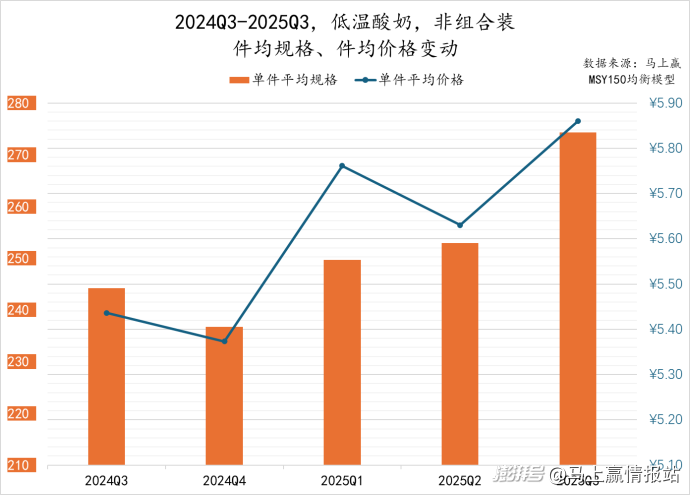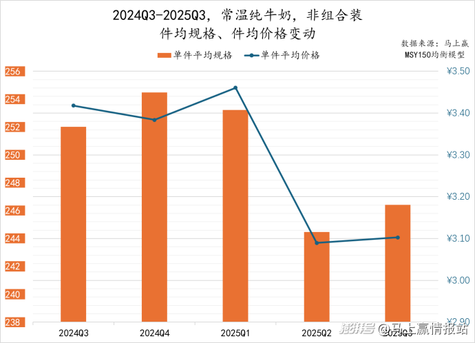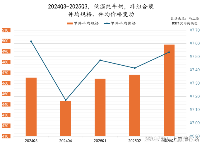2024Q3至2025Q3,低溫純牛奶非組合裝產(chǎn)品的件均規(guī)格和件均價(jià)總體均呈現(xiàn)先降后升的波動(dòng)態(tài)勢(shì)。規(guī)格在2024Q4縮減至443ml,隨后持續(xù)提升至近500ml,達(dá)到近五季最高水平。件均價(jià)方面也呈現(xiàn)波動(dòng)變化,2024Q3為7.6元,2024Q4下降至7.15元,2025Q1至Q3波動(dòng)回升至7.50元。