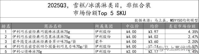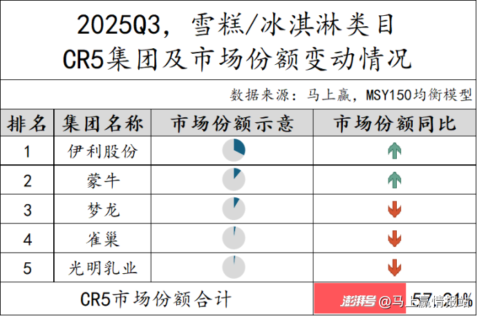 2025Q3,雪糕/冰淇淋CR5集團(tuán)市場(chǎng)份額合計(jì)為 57.21%,市場(chǎng)集中度較低。具體來(lái)看,伊利股份和蒙牛位居市場(chǎng)份額前二的同時(shí)市場(chǎng)份額依然同比增長(zhǎng),而夢(mèng)龍、雀巢和光明乳業(yè)的市場(chǎng)份額則呈現(xiàn)同比下滑,雪糕/冰淇淋類目頭部陣營(yíng)的市場(chǎng)掌控力持續(xù)鞏固。