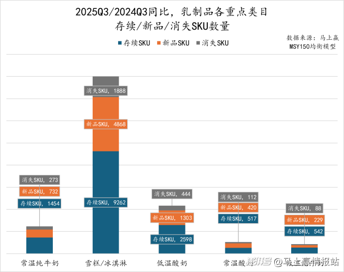 從2025Q3/2024Q3的同比情況來(lái)看,雪糕/冰淇淋依舊是SKU規(guī)模最大的類目,存續(xù)SKU高達(dá)9262款,新品SKU達(dá)4868款,遠(yuǎn)高于消失SKU的1888款,顯示出該類目產(chǎn)品更新汰換節(jié)奏快、市場(chǎng)活躍度強(qiáng),品牌推新持續(xù)保持高熱度。低溫酸奶類目SKU數(shù)量位居第二,存續(xù)SKU為2598款,且新品SKU數(shù)量遠(yuǎn)高于消失SKU數(shù)量,體現(xiàn)出了其較為活躍的產(chǎn)品創(chuàng)新與增量空間;常溫純牛奶方面,新品SKU略高于消失SKU,產(chǎn)品結(jié)構(gòu)平穩(wěn)、推新節(jié)奏溫和。常溫酸奶、低溫純牛奶目前SKU規(guī)模都相對(duì)較小,但新品SKU均大于消失SKU,整體類目產(chǎn)品創(chuàng)新還是活躍為主基調(diào)。