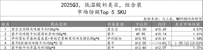 在組合裝產(chǎn)品方面,蒙牛集團(tuán)則表現(xiàn)更加強(qiáng)勢(shì),有三款產(chǎn)品躋身TOP5。君樂(lè)寶雖僅有一款產(chǎn)品上榜,但占據(jù)4.07%的市場(chǎng)份額,領(lǐng)先2-5名市場(chǎng)份額較多展現(xiàn)出強(qiáng)勢(shì)競(jìng)爭(zhēng)力,此外伊利股份也有一款產(chǎn)品憑借組合口味位列第三。具體來(lái)看,低溫酸奶組合裝產(chǎn)品TOP 5 SKU風(fēng)味更加多樣,價(jià)格也從9.9元至15元不等。