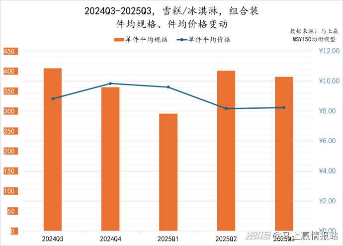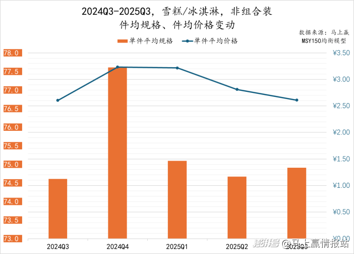 2024Q3至2025Q3,雪糕/冰淇淋非組合裝產(chǎn)品的件均規(guī)格和件均價(jià)波動(dòng)特征差異較大。件均規(guī)格在2024Q4提升后下滑,除2024Q4提升超過(guò)77.5g以外,其余四個(gè)季度均在74.5g-75g區(qū)間波動(dòng)變化。件均價(jià)則相對(duì)穩(wěn)定,同樣是在2024Q4提升至3.2元并在2025Q1保持穩(wěn)定,隨后連續(xù)下降至2.6元,恢復(fù)至2024年同期水平。