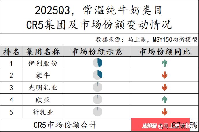 2025Q3,常溫純牛奶作為市場(chǎng)占比最高的類目,CR5 集團(tuán)市場(chǎng)份額合計(jì)高達(dá)87.15%,新乳業(yè)集團(tuán)代替天友乳業(yè)躋身CR5集團(tuán)。從份額變動(dòng)看,伊利股份在市場(chǎng)份額占比最高的情況下依舊同比提升,歐亞也有所提高,蒙牛、光明乳業(yè)和新乳業(yè)則同比下降。