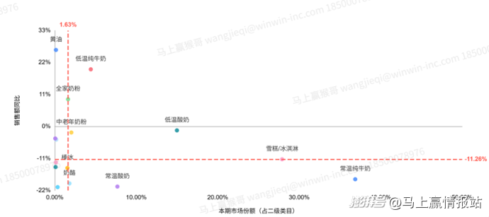 從銷售額同比變化來(lái)看,乳制品各類目分化較為顯著。占比較高的類目中,低溫純牛奶表現(xiàn)較為突出,銷售額同比增速超過(guò)19%,黃油、全家奶粉也呈現(xiàn)正向增長(zhǎng);低溫酸奶、中老年奶粉同比去年則基本持平。