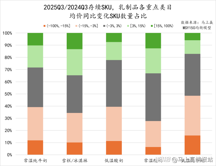 從2025Q3/2024Q3的同比情況來(lái)看,各乳制品類目的存續(xù)SKU在均價(jià)變化上的分布整體呈現(xiàn)出“降價(jià)占主導(dǎo)、漲價(jià)有限”的格局。具體來(lái)看,處于均價(jià)基本持平(-3%~3%)區(qū)間的SKU占比普遍在30%左右,約三分之一的存續(xù)產(chǎn)品價(jià)格維持穩(wěn)定;降價(jià)SKU占比方面,低溫純牛奶、常溫純牛奶及低溫酸奶三個(gè)類目,輕微和明顯下浮區(qū)間的SKU合計(jì)占比40%左右,遠(yuǎn)大于輕微上浮+顯著上浮的占比,價(jià)格壓力較為顯著。