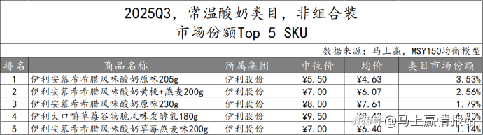 在非組合裝產(chǎn)品中,TOP 5 SKU由伊利股份獨(dú)攬。具體來(lái)看,五款頭部產(chǎn)品主要為安慕希系列,涵蓋原味、黃桃+燕麥及草莓燕麥,均價(jià)區(qū)間在5.5元-8元。此外,另有一款“大口嚼草莓谷物脆風(fēng)味發(fā)酵乳”產(chǎn)品進(jìn)入TOP5 SKU之列,其谷物+酸奶拌著吃的獨(dú)特吃法,正在受到更多消費(fèi)者的選擇。