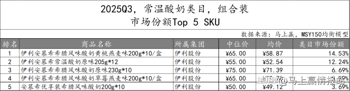 在組合裝產(chǎn)品TOP 5 SKU的集團(tuán)歸屬上,伊利股份依舊獨(dú)攬五席。TOP 5 SKU中的安慕希系列組合裝產(chǎn)品憑借不同口味和規(guī)格,占據(jù)了43.04%的市場(chǎng)份額,顯示其在產(chǎn)品布局、渠道覆蓋和品牌影響力方面的絕對(duì)優(yōu)勢(shì)。