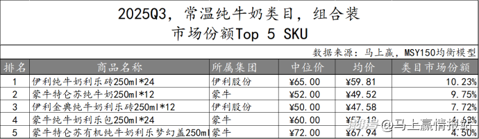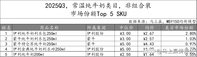 2025Q3常溫純牛奶非組合裝產(chǎn)品市場(chǎng)份額TOP 5 SKU均歸屬伊利股份、蒙牛兩大集團(tuán),其中伊利股份的三款產(chǎn)品憑借不同規(guī)格、包裝形式位列第一、第四和第五,蒙牛集團(tuán)則有2款產(chǎn)品進(jìn)入榜單。總體來(lái)看,TOP 5 SKU規(guī)格都為200ml或250ml,均價(jià)在2-5元之間,基本都是個(gè)人單次飲用的小包裝規(guī)格,較低的價(jià)格也進(jìn)一步降低了消費(fèi)決策的門檻。
