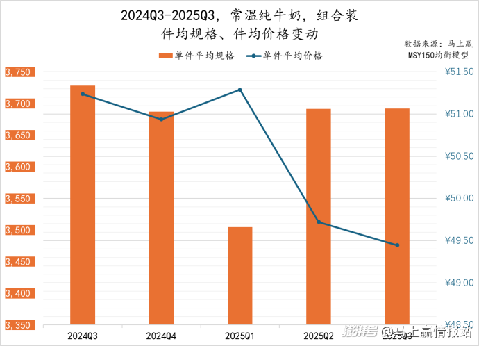 從組合裝來(lái)看,常溫純牛奶組合裝產(chǎn)品的件均規(guī)格呈現(xiàn)出“先落后穩(wěn)”的走勢(shì)。件均規(guī)格在2024Q4小幅縮減,隨后在2025Q1進(jìn)一步下滑至近五個(gè)季度最低的3500ml,推測(cè)或受春節(jié)期間渠道促銷、小包裝需求增長(zhǎng),以及春節(jié)禮贈(zèng)場(chǎng)景更高端化,可能規(guī)格更小等因素影響。在進(jìn)入2025Q2后,平均規(guī)格回升至3700ml,并保持穩(wěn)定。價(jià)格方面,件均價(jià)在2024Q3和2025Q1均維持在約51.25元的高位,經(jīng)過(guò)春節(jié)后的2025Q2則降至49.75元,且在2025Q3繼續(xù)小幅下滑。