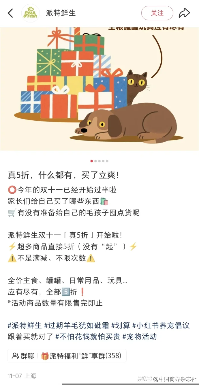 派特鮮生小紅書賬號最新的一條信息發(fā)布于11月7日,內容為“雙11”“真5折”的促銷活動。