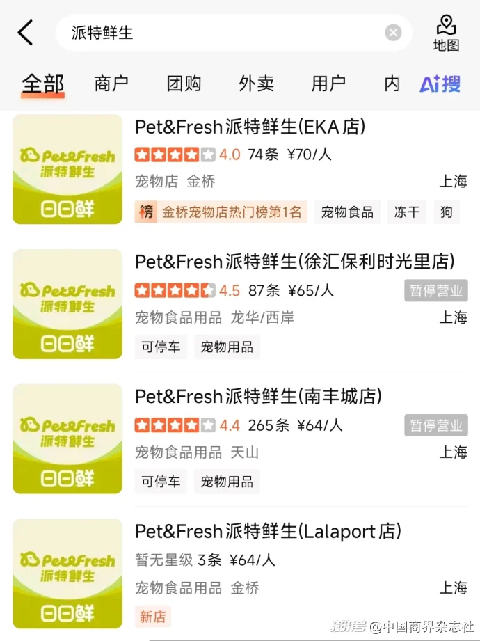 大眾點評App顯示,派特鮮生在上海開設的18家門店中,有6家顯示“暫停營業(yè)”、1家顯示“歇業(yè)關閉”,其中有門店開業(yè)僅3個多月。