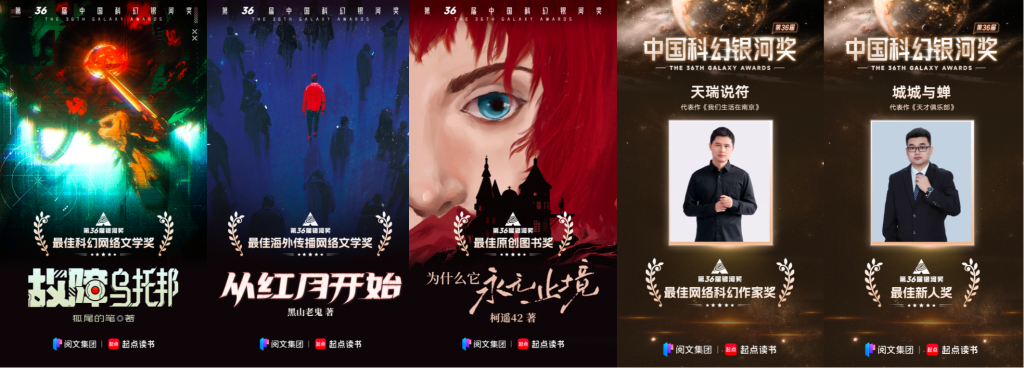 在今年舉行的中國(guó)科幻銀河獎(jiǎng)上,閱文旗下網(wǎng)絡(luò)作家狐尾的筆憑借《故障烏托邦》奪得最佳科幻網(wǎng)絡(luò)文學(xué)獎(jiǎng),柯遙42憑借《為什么它永無(wú)止境》獲得最佳原創(chuàng)圖書(shū)獎(jiǎng),城城與蟬獲得最佳新人獎(jiǎng),已經(jīng)三次獲得“銀河獎(jiǎng)”的作家天瑞說(shuō)符獲得最佳網(wǎng)絡(luò)科幻作家獎(jiǎng),黑山老鬼憑借《從紅月開(kāi)始》獲得最佳海外傳播網(wǎng)絡(luò)文學(xué)獎(jiǎng)。